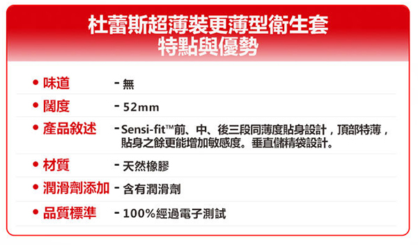 前、中、後三段同薄度貼身設計,比一般杜蕾斯衛生套薄20%,但仍保持一貫的安全度及保護。